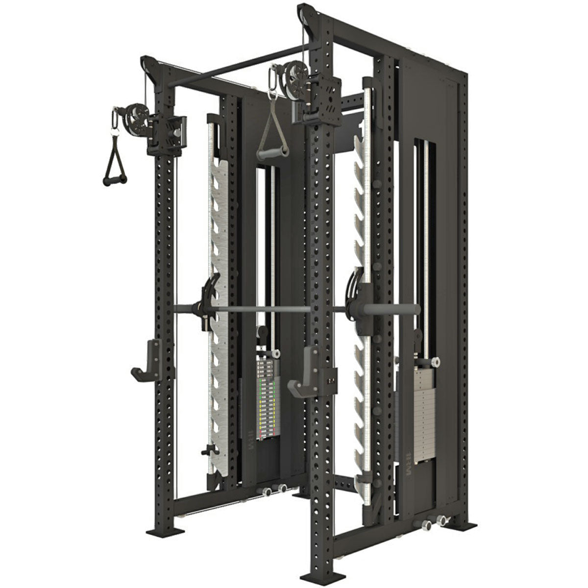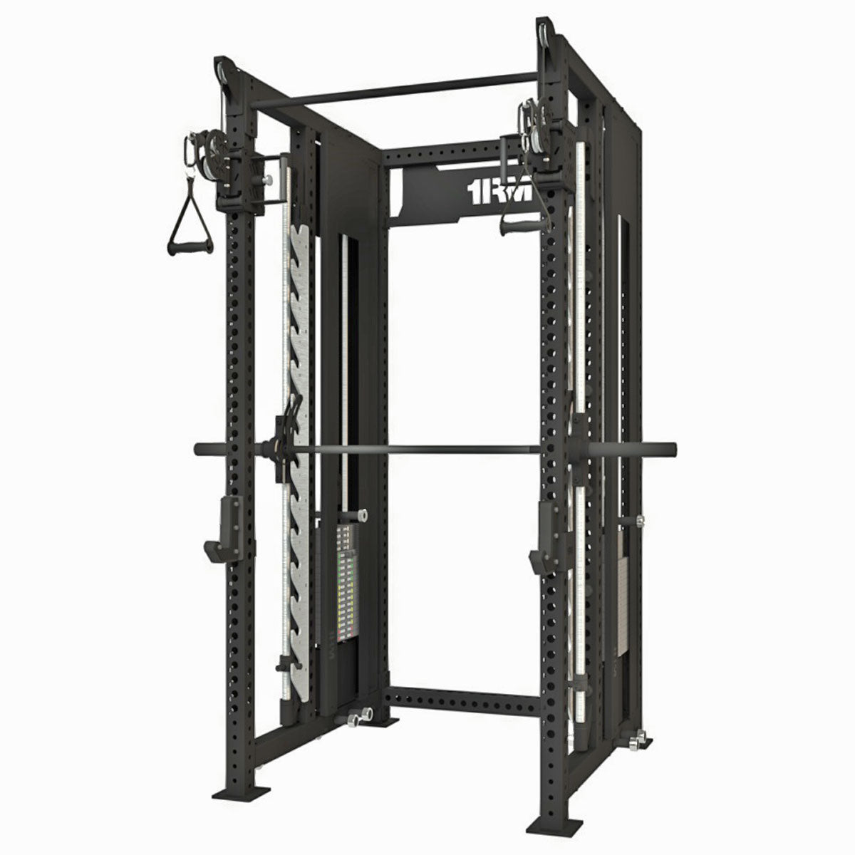 The 1RM Ebony Smith Functional Trainer Rack is a commercial-grade training system built around the 1RM modular platform. This configuration combines a free-weight squat rack, dual-stack functional trainer and heavy-duty Smith machine into a single, compact frame - giving you barbell work, cables and guided lifting without moving between stations.