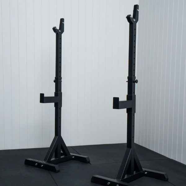The 360 Strength Squat Stands (360S-HOSQUAT) have a heavy duty steel frame and are perfect for home or light commercial use. Finished in a textured matte black powdercoat, the stands include adjustable height uprights and spotter arms, additional bracing and easy to use locking pins making them strong, durable and easy to use and adjust.
