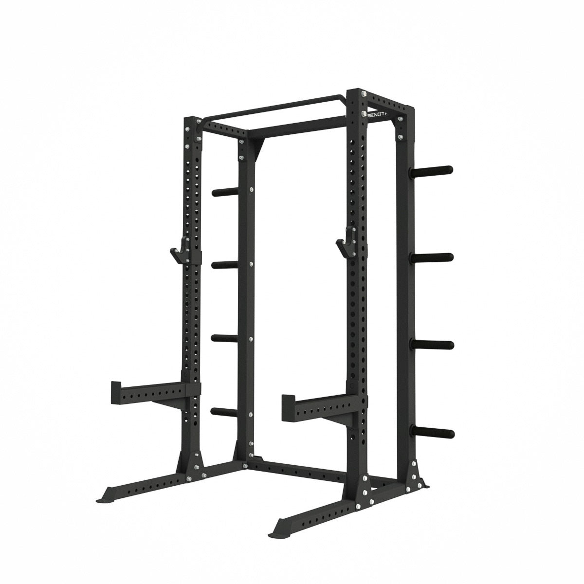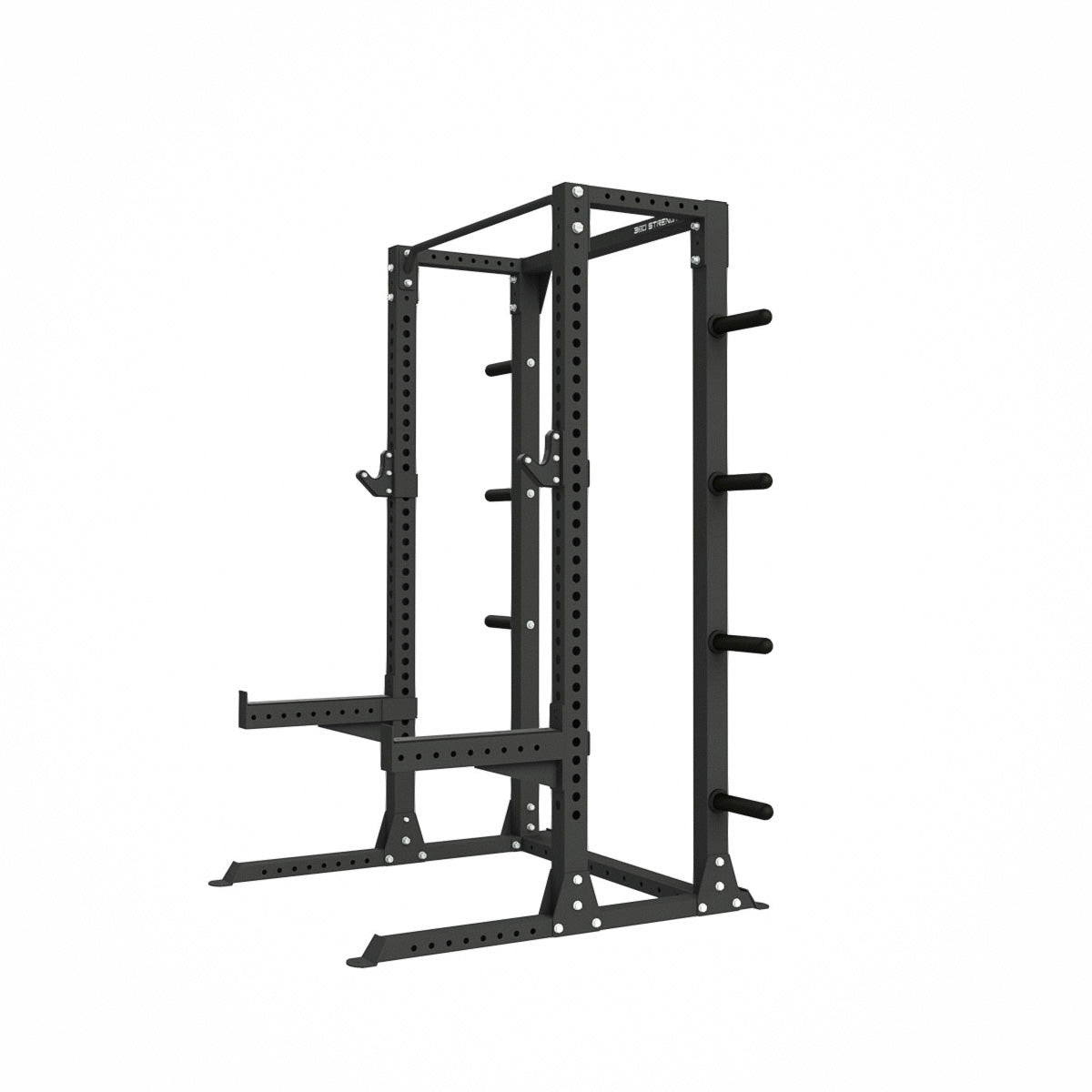 The rack comes complete with heavy duty custom j-hooks and spotter arms, laser cut numbers on the uprights, single chin-up bar and plate storage, all finished in a smooth, blemish-free surface with a matte black powdercoat.
