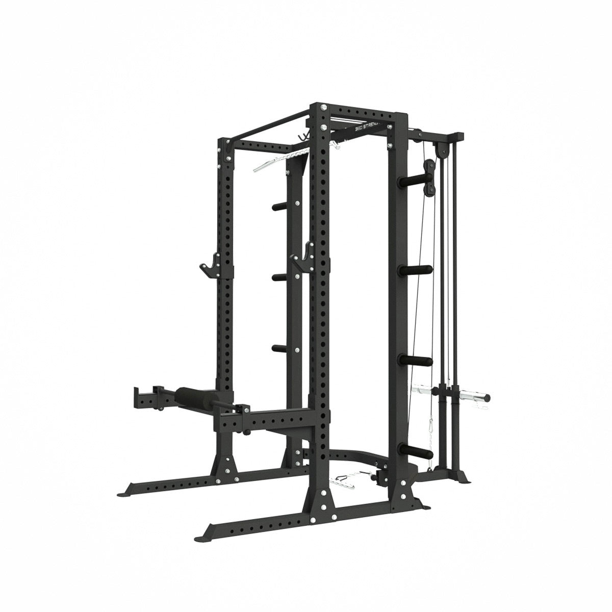Designed for a wide range of uses from free weights enthusiasts to power lifters in a home or studio setting, this light commercial squat rack with lat pulldown and low row attachment provides a versatile and modular training system, allowing you to perform a complete range of barbell and bodyweight exercises safely and securely.